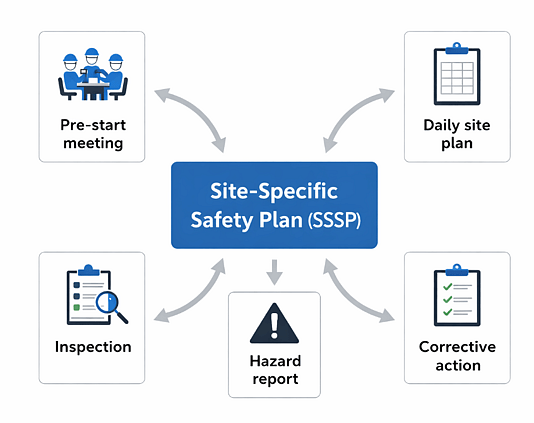 A Site-Specific Safety Plan is intended to show how health and safety risks will be managed on a particular site, for a specific scope of work, at a specific time.